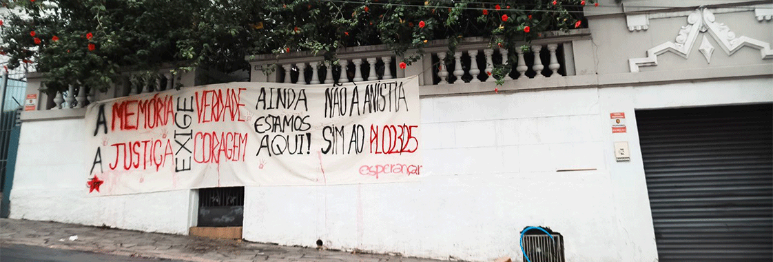 A intervenção traz manchas “de sangue” sobre os dizeres “A memória exige verdade, a justiça exige coragem”, “Ainda estamos aqui” e o pedido de “Não à anistia, sim ao PL 023/25” que se refere ao projeto de criação da Comissão da Verdade Municipal protocolada pela Vereadora Juliana de Souza (PT). A mensagem lembra a importância da defesa da nossa democracia, para que capítulos de repressão, censura e tortura não se repitam na nossa história. Somado a isso, busca a responsabilização dos golpistas do 8 de Janeiro, ou seja, a prisão de Jair Bolsonaro e seus generais, que tentaram o golpe e assassinar o presidente da República e autoridades de estado.