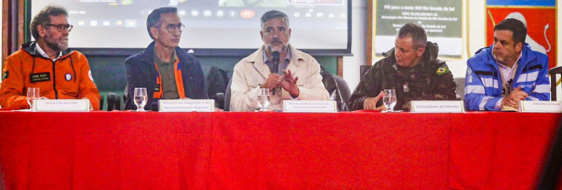 Ontem, dia 10, em Porto Alegre, o Ministro Paulo Pimenta, da Secretaria de Comunicação da Presidência da República, juntamente com Waldez Góes, do Ministério da Integração e Desenvolvimento Regional, José Múcio, do Ministério da Defesa, e os comandantes da Marinha, Exército e Aeronáutica, estiveram presentes na coletiva de imprensa, onde informaram que mais de 63 mil pessoas foram resgatadas de áreas de risco.