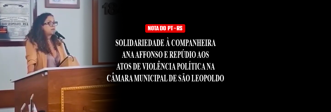 O Partido dos Trabalhadores e das Trabalhadoras do Rio Grande do Sul expressa sua mais profunda solidariedade à Companheira Ana Affonso, Vice-Presidenta do PT-RS e Vereadora em São Leopoldo, diante dos inaceitáveis acontecimentos ocorridos durante a sessão da Câmara de Vereadores na última terça-feira, 26 de março.